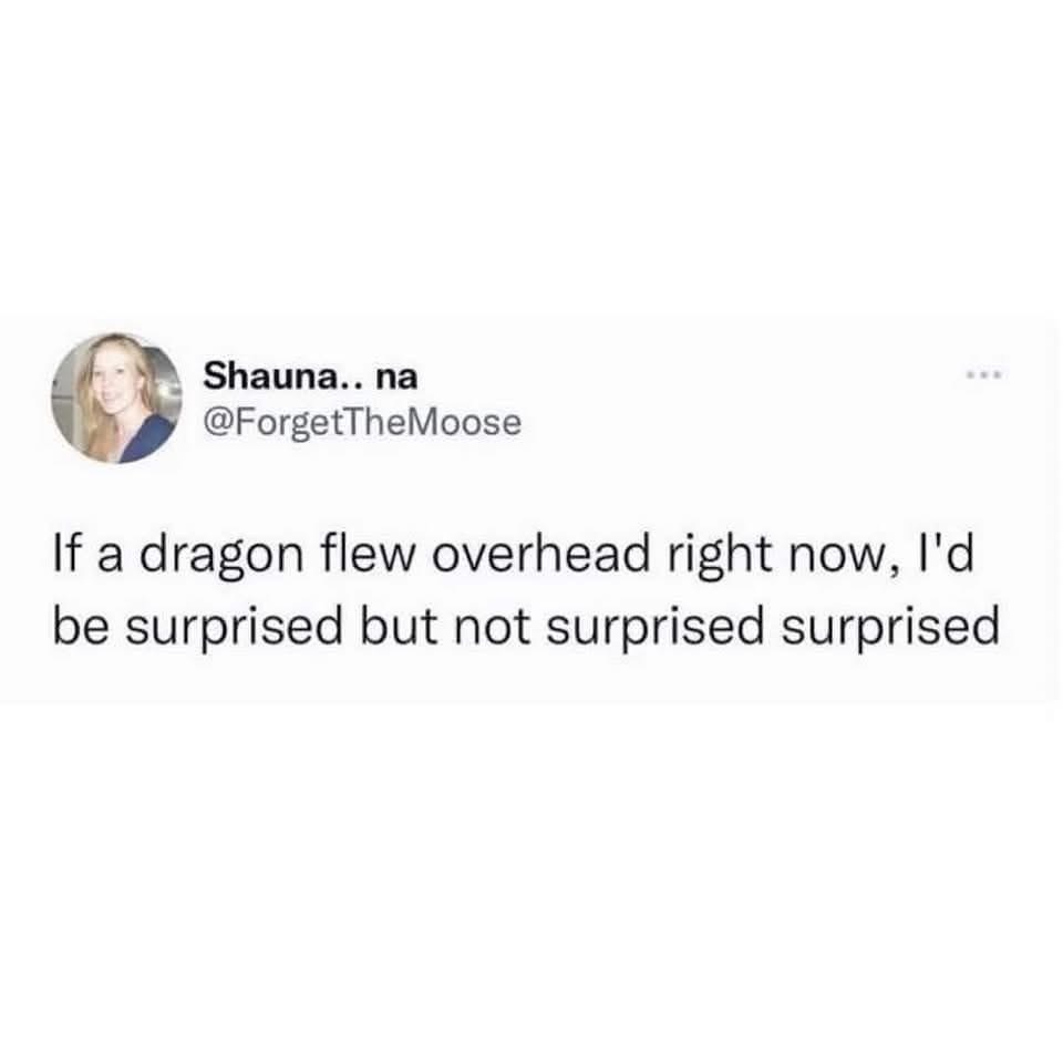If a dragon flew overhead right now I’d be absolutely delighted, run outside waving and shrieking “OMG look everyone it’s a fucking dragon I can’t believe it I’m so excited” and promptly be incinerated by said dragon.