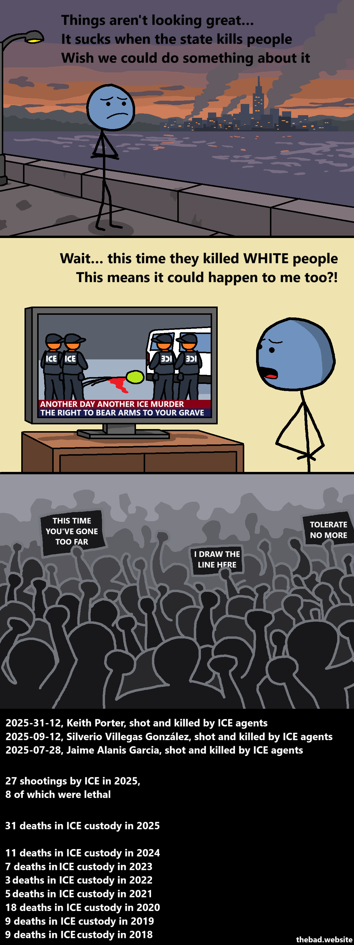 This. People were already protesting ICE long before Renée Good got killed. The racists, white supremacists, and nazis are still not protesting today. They don’t care if a murdered protestor is white. A Nazi is going to view any white protesters as race traitors. What’s happening right now is a dramatic shift in the scope of what ICE is doing. Rather than simply targeting immigrants, it’s being deployed against protestors and in crowd control efforts. The extent of people they’re targeting and how they’re targeting them is dramatically expanding as well.