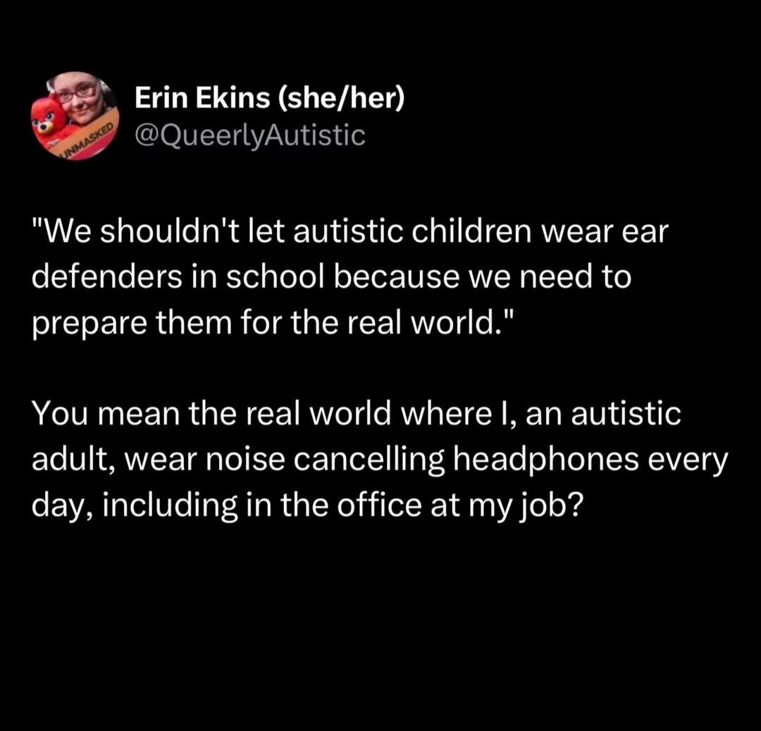 Like the earplug thing just shouldn’t be an issue at all. It seems to be one sometimes, but not allowing someone to wear earplugs won’t prepare them to deal with ppl trying to prevent to do that in the future.