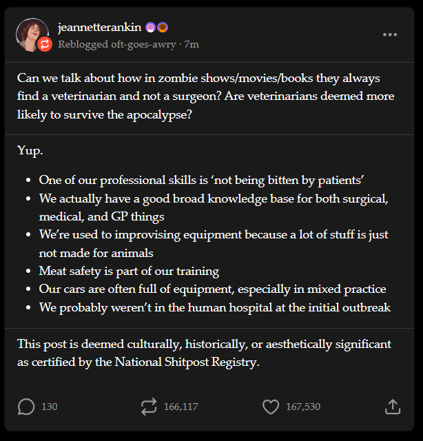 As a veteran, I thought this was going a different route when it mentioned “vets.” But it’s very true. I’d trust a veterinarian as a doctor in the zombie apocalypse.