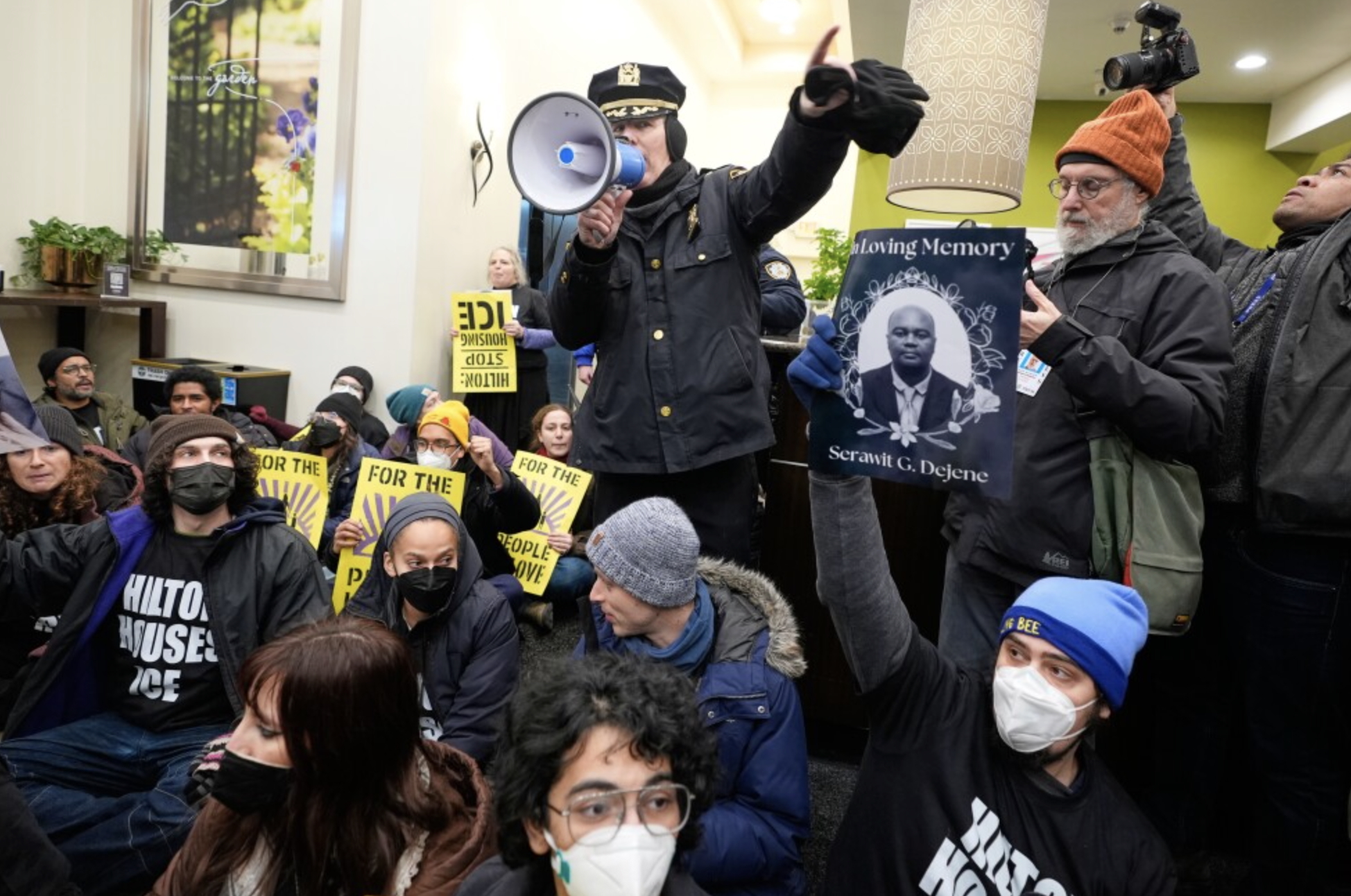 Demonstrators occupied the lobby of a Hilton Garden Inn in Manhattan on January 27. Protesters took over the lobby, demanding that the corporation leave Manhattan and stop cooperating with ICE.