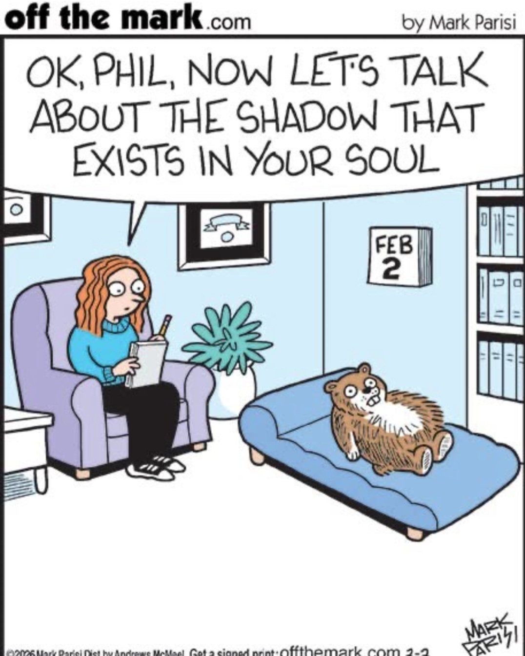 The groundhog is in therapy, the joke is that therapists want to talk about deeper trauma (tell me about your childhood, etc) because people’s issues are rarely superficial.