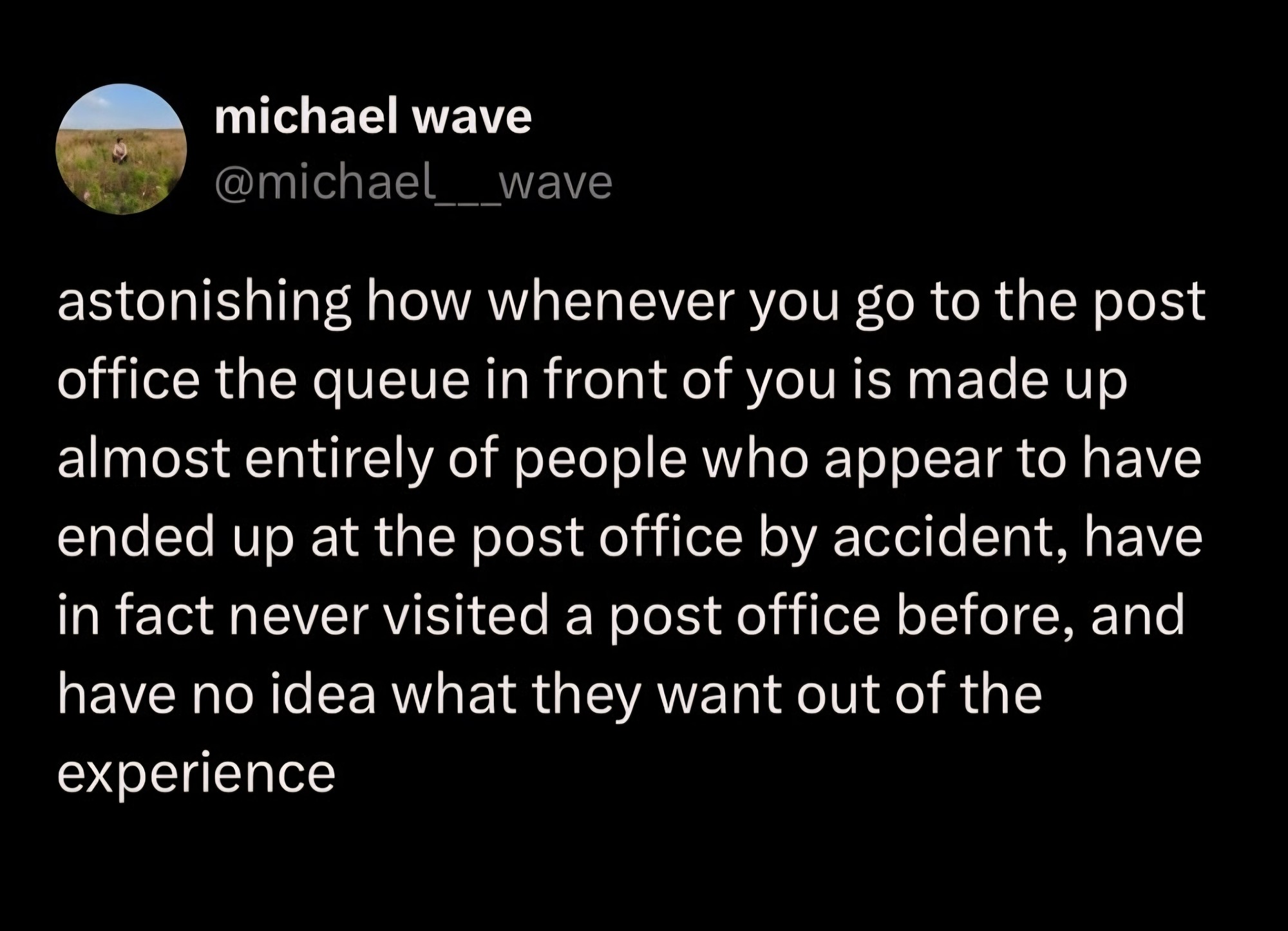 Missing the weirdly-dressed Boomer who clearly has been in a post office before, and has unreasonable expectations, but also doesn’t seem to know anything about how this post office works, and has questions and needs something special from the back.