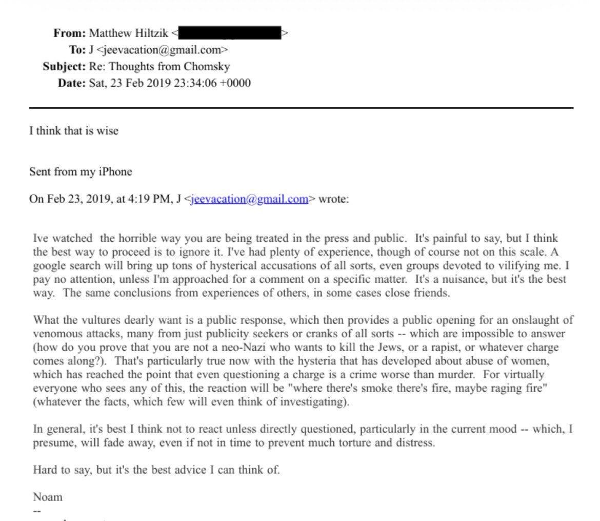 Chomsky’s Wikipedia article has a section on his friendship with Epstein. It mentions Chomsky wanting to take his wife to visit Epstein in the Caribbean, which seems an unlikely thing to do if he believed the allegations. But it also sounds like he was was way too dismissive of sexual misconduct allegations in general.
