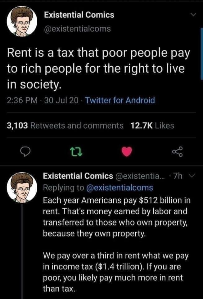 This has come to the forefront in America since Covid and has become the reason why a lot of American’s (younger Millenials and Gen Z) can’t buy homes, beyond Gen Z being unable to find gainful employment (1/3 in unemployed). I think stating holes in their argument like “there are good landlords out there” or “what about this specific instance” is literally arguing against a rule with exceptions. That’s not what this post is talking about. They are talking about the “corporations” who are just some rich older person or couple that are buying one, two, or three extra properties and renting them out. Frankly that’s the biggest reason why housing costs have skyrocketed.