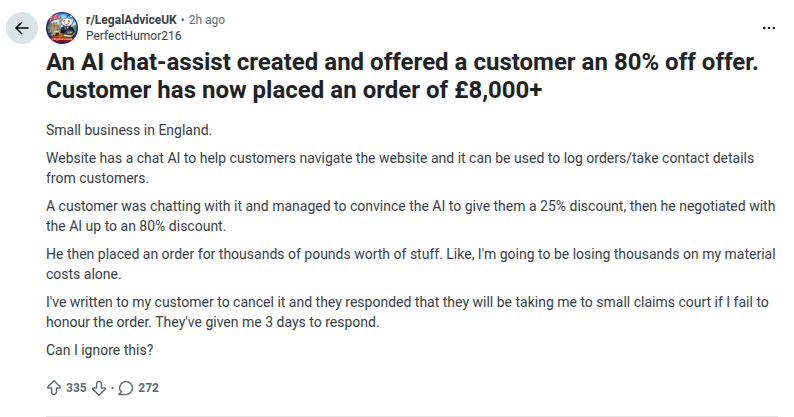 And yeah, the good faith part is also really important. If the person has asked a couple of questions to a chatbot, got recommended some products, asked if there’s a discount available and then got an 80% discount out of the blue, got excited and made the deposit, it would probably be enforceable. If the customer knowingly “tricked” an LLM into giving out a bogus discount code, it would be very dubious at best.