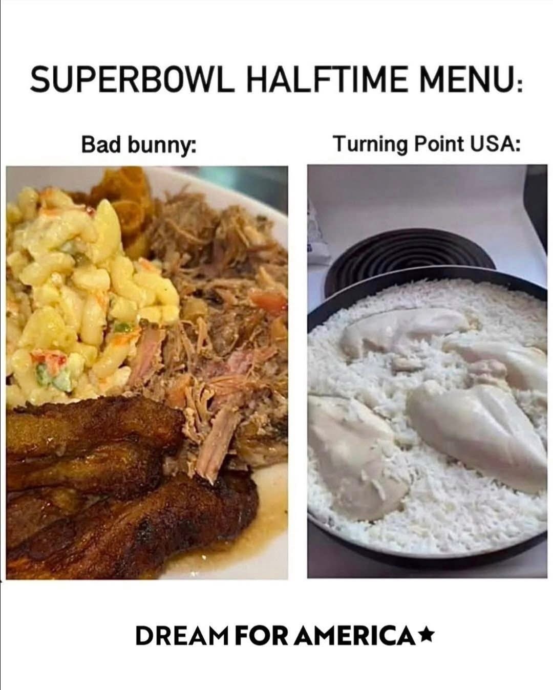 Nothing in this meme makes fun of European cuisine. It makes fun of a very specific subsection of White people in the U.S. who would watch the TPUSA halftime show instead of Bad Bunny.