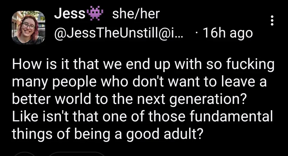 Point of that schpiel in part being that, while I recognise outliers exist (and don’t skew the initial general statement), I’d also wager that a number of people identifying as “choosing not to have kids”, may be making that call not based on their desire to have children/a next generation, but rather on their personal circumstances excluding them from having that choice. It’s a lot like someone saying “I choose not to buy a $10 million car”… you ain’t really making a choice, unless you have $10 million sitting around that you could use on a luxury purchase.