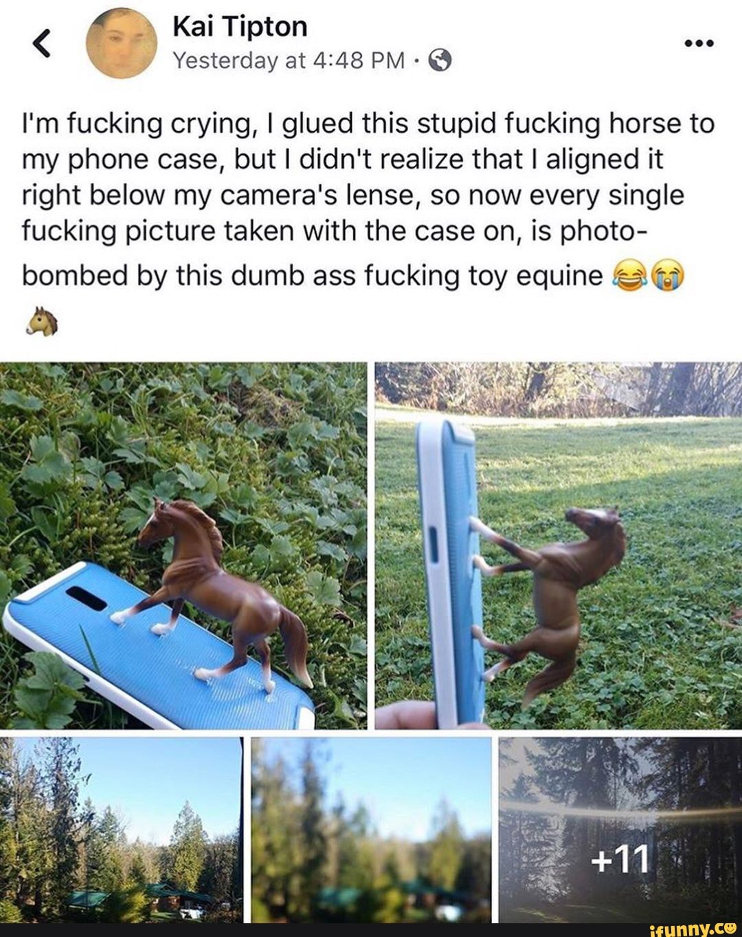 There are multiple jokes here. On one hand, there is a horse in front of the camera, on the other hand, the phone case is obviously beyond useless anyways because it has a horse glued to it.