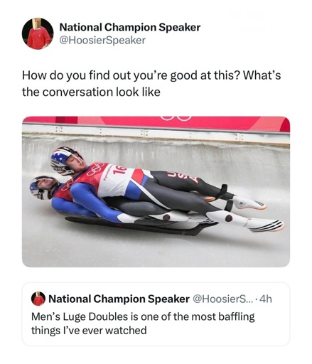 minus-squareSunsofold@lemmings.worldlinkfedilinkarrow-up9arrow-down2·7 days agoLuge is confusing enough. This is just moreso.