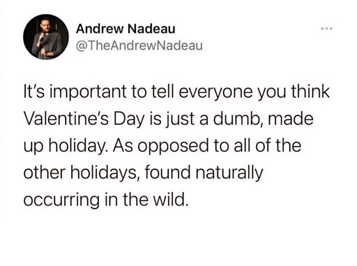 Exactly. Your significant other isn’t guilt tripping you into spending money on Presidents’ Day. Easy holiday to ignore versus our society having emotional breakdowns because they were forgotten on Valentine’s Day or their partner didn’t do enough to make them feel special.