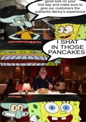 Does Squidward’s smile on the last panel imply that getting your pancakes shat in is the authentic Denny’s experience?