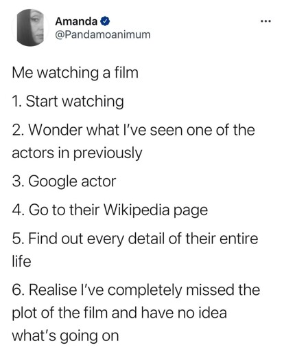 It bothers me so much when people get distracted but don’t pause the movie. Sometimes they go to the bathroom and tell me not to pause it and I don’t care, I’m pausing it anyway! They’re going to watch it all whether they want to or not.