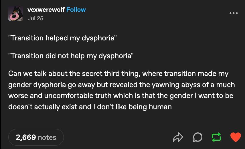 You can see how it would be difficult for me to transition in any meaningful way