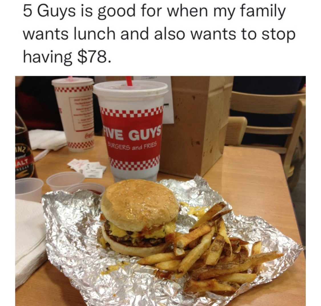 Interesting and very unfortunate. I loved Five Guys when I first visited the US and they opened one up in Australia and the prices are so high it’s insulting and I’ve never been.