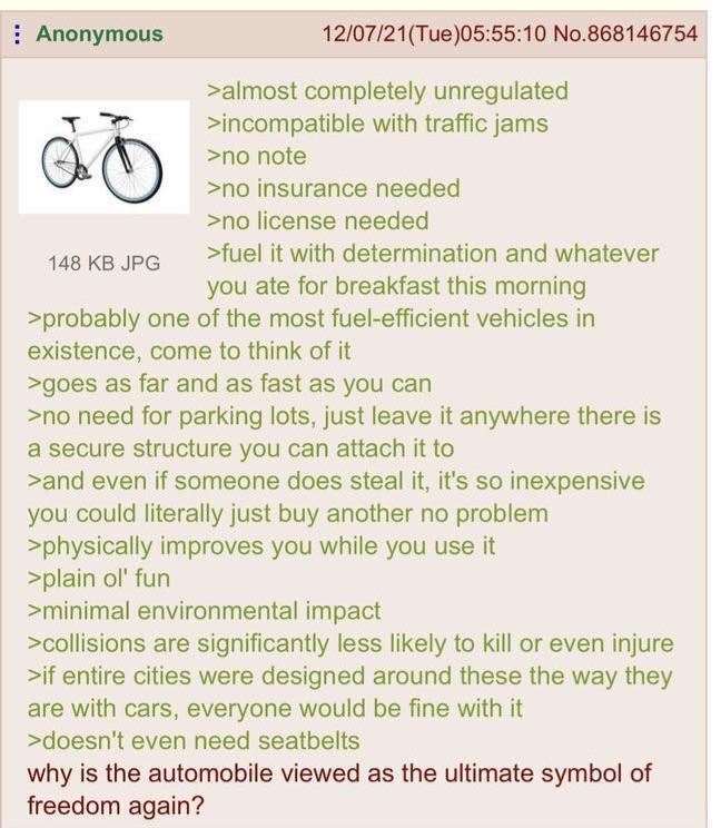 The OP was asking why the car is a symbol for freedom and not the bicycle, so I provided some possible explanations.