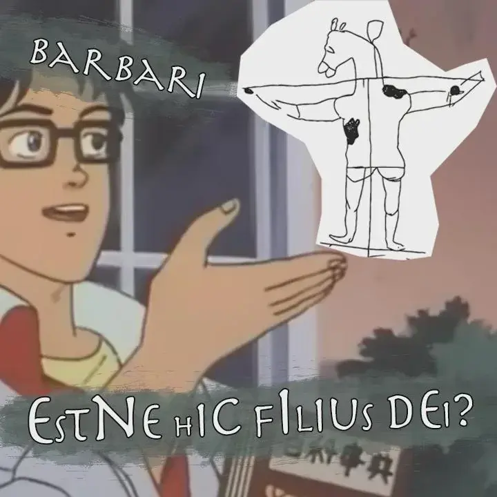 The Latin text reads “Barbarians” at the top, and “Is this the son of God?” at the bottom, in the vein of the classic “Is this a pigeon?” meme of some anime guy gesturing at a butterfly.