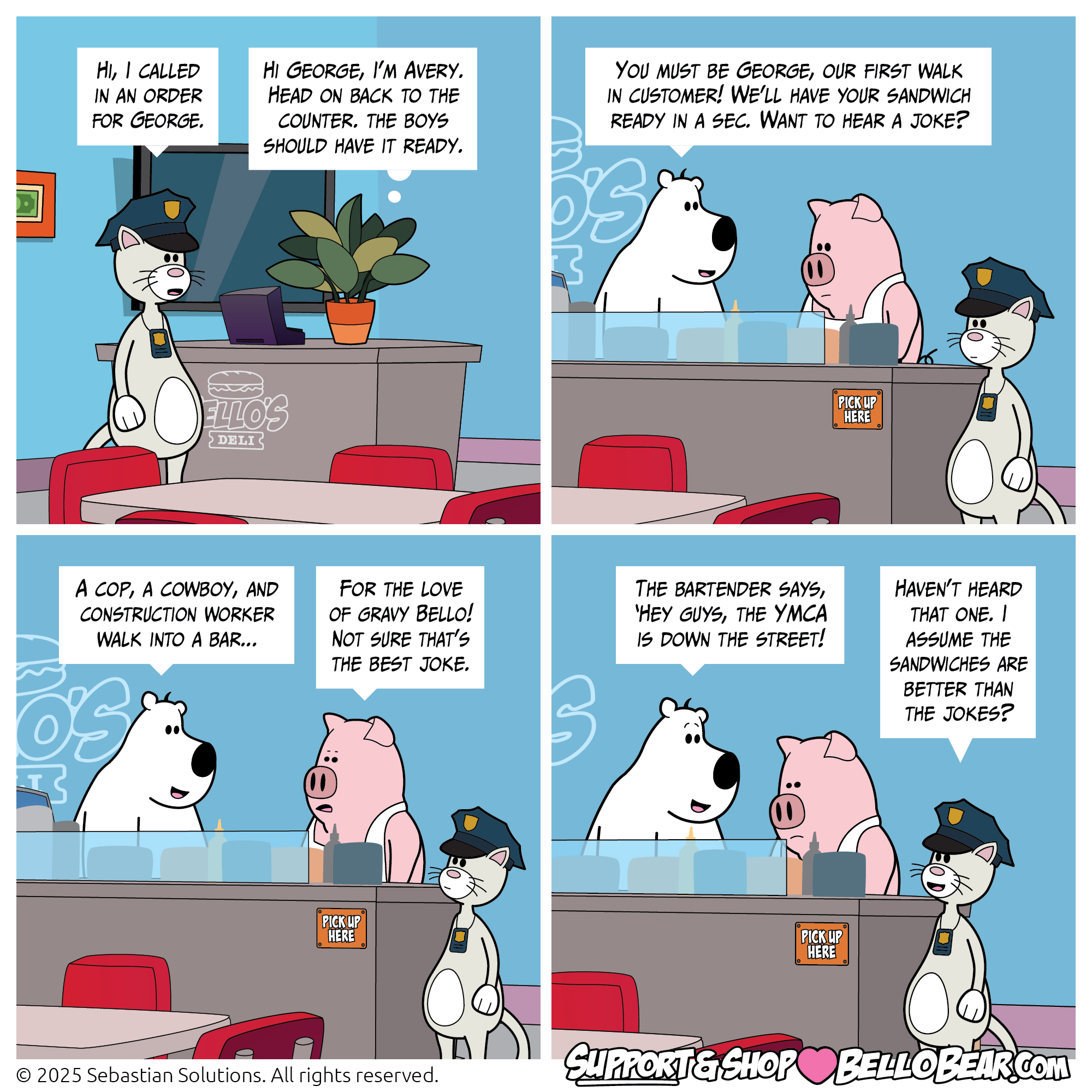 If you really wanted to tell a Village People joke, why not put it in one frame? Have those three uniformed people walk up to the counter and Bear can say their joke.