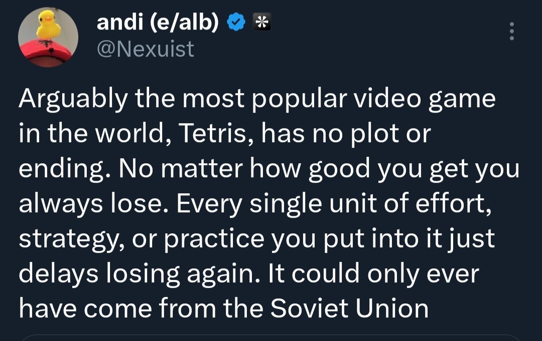 The Picard Maneuver@lemmy.world to Gaming@lemmy.worldEnglish · 8 months agoTetrislemmy.worldimagemessage-square118fedilinkarrow-up1925arrow-down147